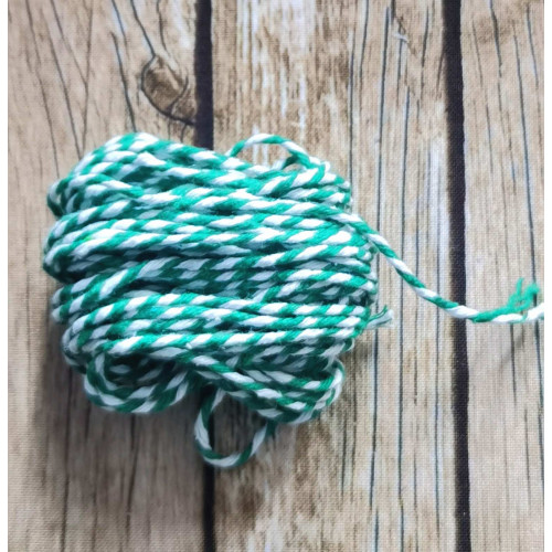 Бавовняний шнур біло-зелений зі стійким забарвленням. Скручений з золотою ниткою. Використовується у виготовленні квіткових композицій, сумок, скрапбукінгу, подарункових кошиків, декоруванні квіткових горщиків, рамок, панно тощо.