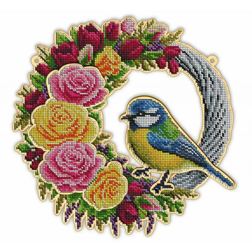 Набір дерев'яних заготовок для створення об'ємного віночка вишитого бісером. Завдяки розміщенню перфорованих пластин для вишивки у два яруси створюється цікавий об'ємний ефект. Віночок підвішується за допомогою мотузка, який прив'язується до передбачених для цього вушок з боків віночку. Віночок складається з кількох перфорованих пластин і допоміжних підкладних пластин. В набір входить фігурний фетр для декорування задньої сторони вишивки